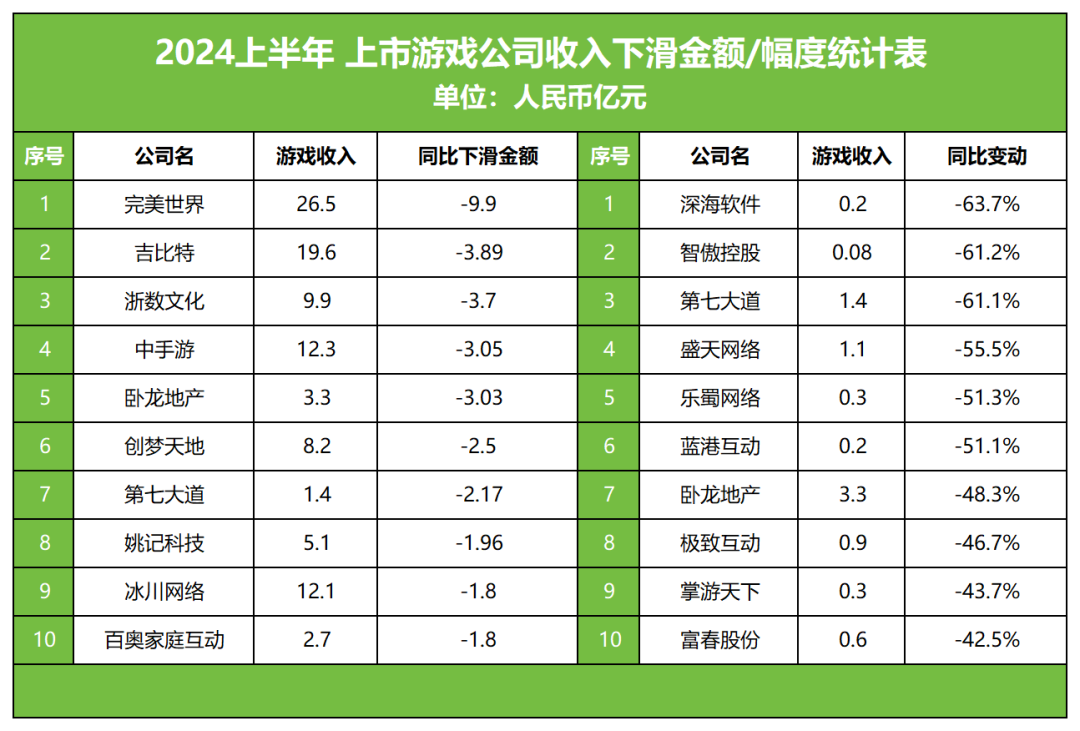 從下圖可知,上半年完美世界同比少收入了9.9億元,位列收入金額下滑排名第一;深海軟件收入下滑了63.7%,位列收入下滑率排名第一。