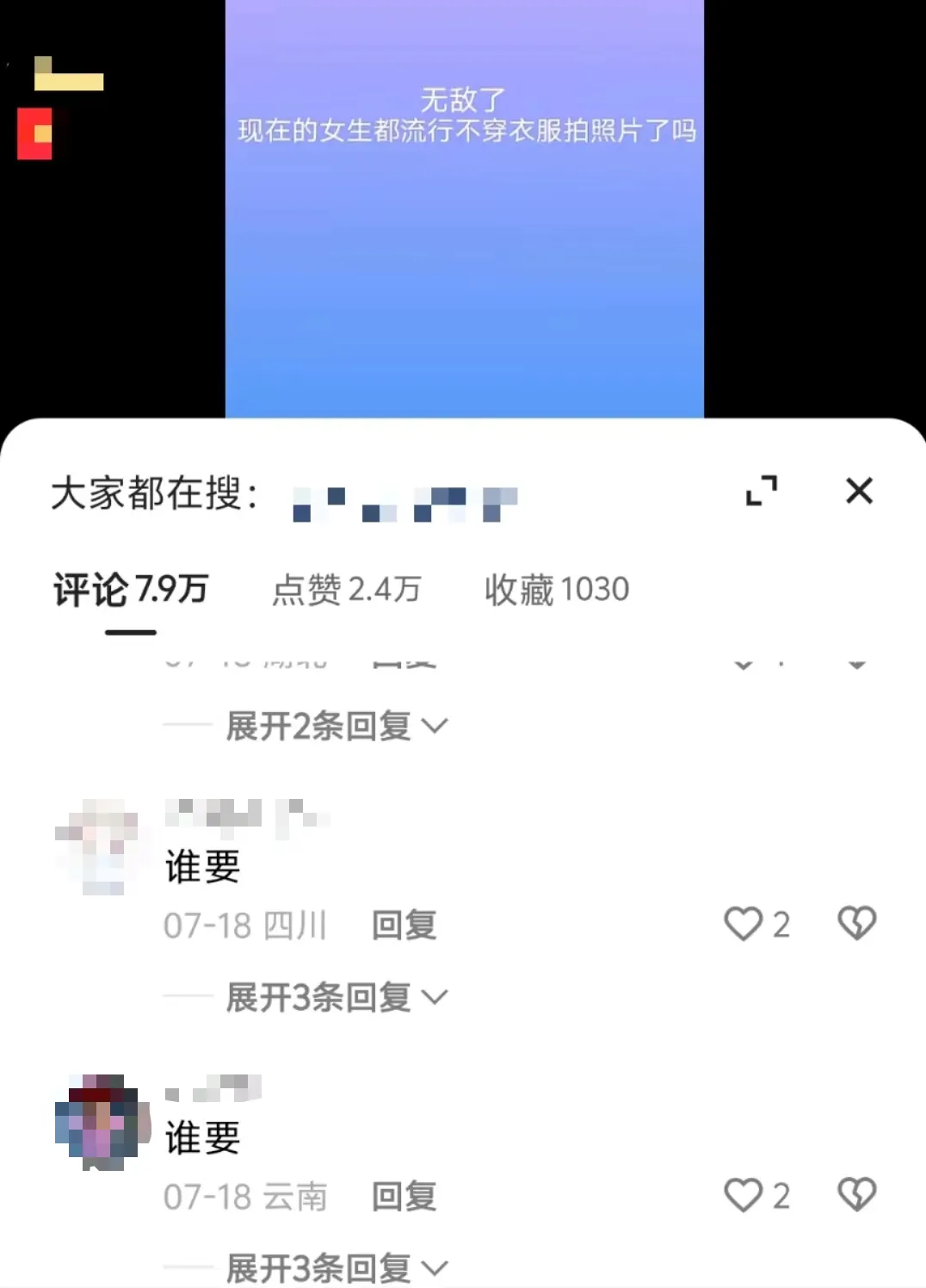 評論區裏全是不穿褲子、只包住隱私部位的照片,還有人直接留言:“想看的私。”