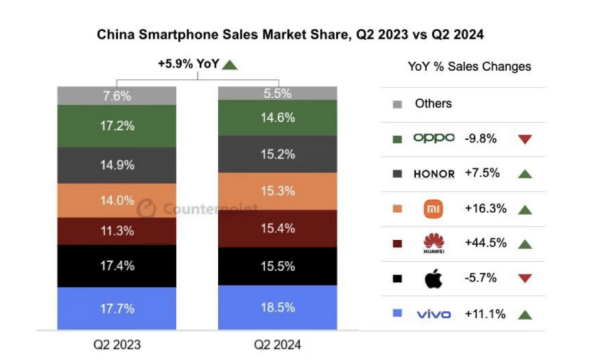 據權威市場研究機構的數據,OPPO在2023年的全球手機出貨量僅為1.031億台,市場份額為8.8%,同比下降了9.9%,排名已滑落到第四位。更為嚴峻的是,在季度排名中,OPPO甚至多次跌出了前五的行列。在國內市場,OPPO的表現同樣不盡如人意,市場份額從2023年一季度的19.6%一路下滑至四季度的16.7%,到了2024年第二季度,更是降至了14.6%,排名也從第一名跌落至第六名。這種連續的下滑趨勢,無疑讓OPPO的市場地位變得岌岌可危。