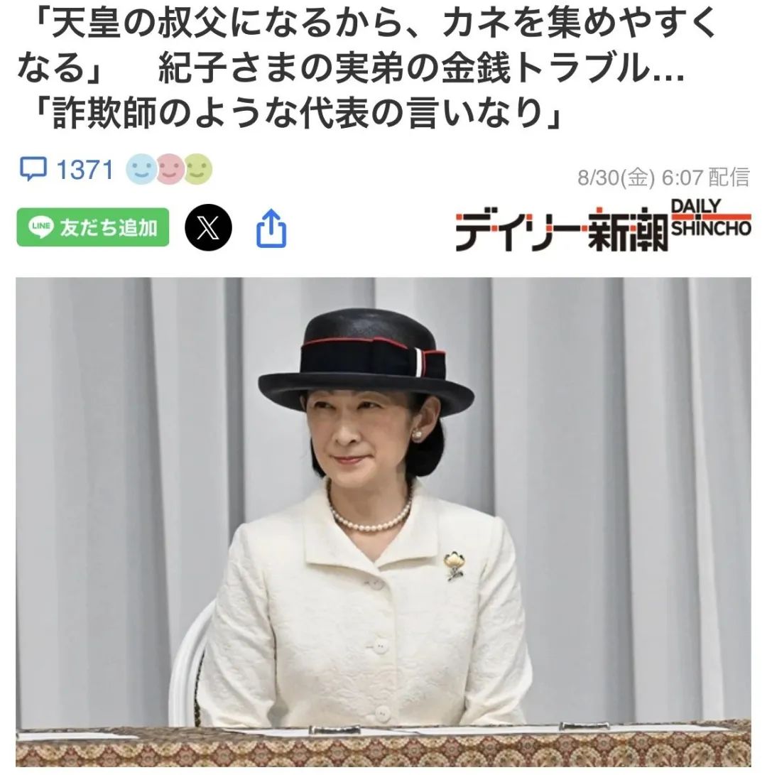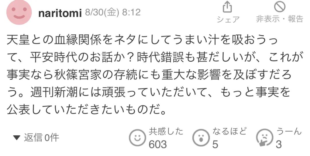 仗着和天皇家有血緣關係來牟利,這是平安時代才會有的事吧?如果一切屬實,怕是會影響到秋筱宮家存續問題。希望《週刊新潮》再接再厲,挖出更多事實。