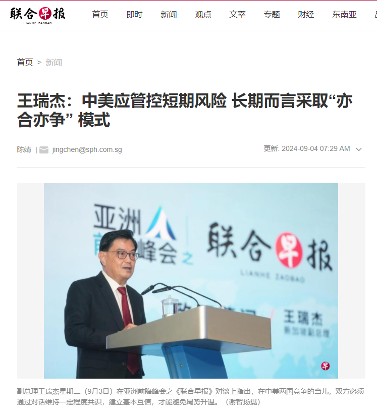 國際社會對中美關係也高度關注,前不久新加坡副總理公開喊話,説中美應管控短期風險,長期而言採取“亦合亦爭”模式。