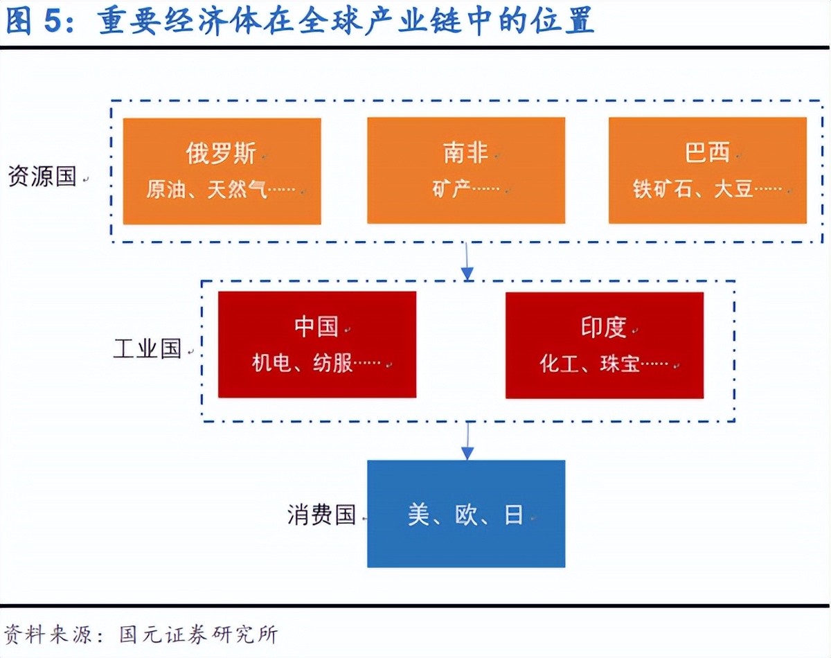 工業國,就是從資源國進口這些原材料,進行工業加工,製造基本工業品(注意這裏説的是基本工藝品,滿足基本生活需求的工藝品),銷往全世界。工業國的代表,當然就是東大,也是世界工廠。當然工業國不止一個東大,還包括之前的日韓,現在的越南等東南亞國家,因為製造業產業鏈一直在轉移。