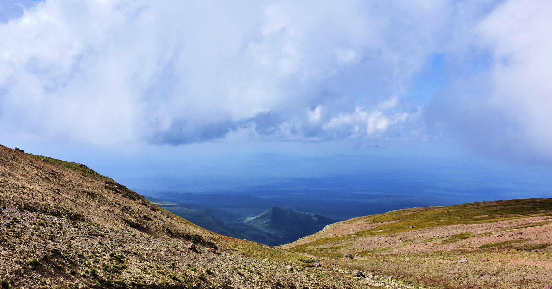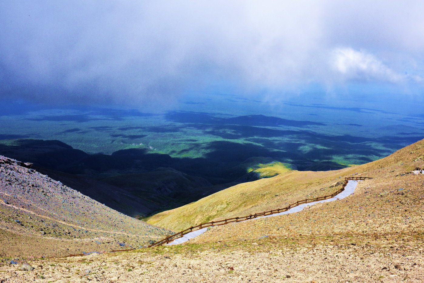 大巴車飛馳在長白山間參天林蔭公路上,放眼仰望車窗外,藍天白雲,長白山的風景真美,從大巴車停車點下車,我們直接乘上開往天池的小型客車,汽車穿行在陡峭蜿蜒通往長白山頂崎嶇公路上,讓人膽顫心驚的同時,不得不佩服師傅們嫺熟的駕車技術,車子行駛在如此陡峭彎曲的山路,他們眼中視如平原。