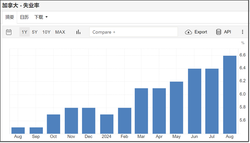 過去一年,加拿大的失業率也在持續上升,最新8月失業率也上升到6.6%;