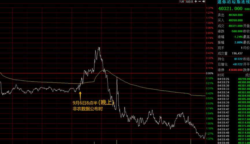 9月6日晚上8點半,非農數據公佈後,美股盤前期貨指數是一度出現上漲,但開盤後很快就一路下跌。