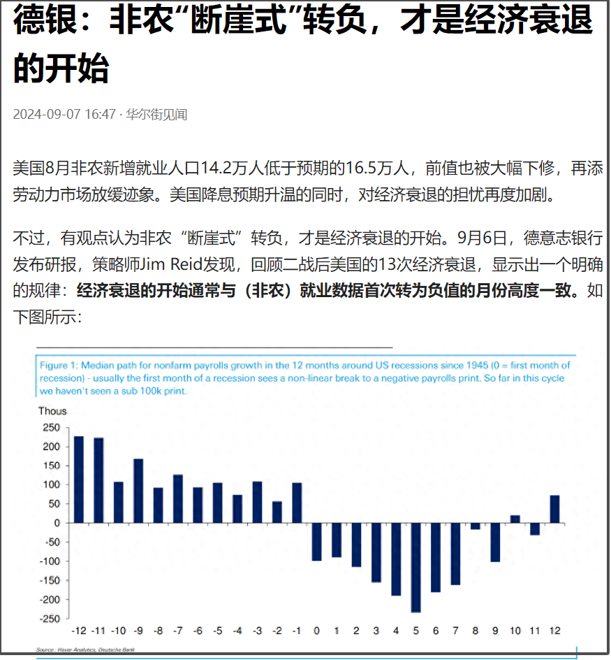 比如德銀就有個研報稱,回顧二戰後美國的13次經濟衰退,顯示出一個明確的規律:經濟衰退的開始通常與(非農)就業數據首次轉為負值的月份高度一致。