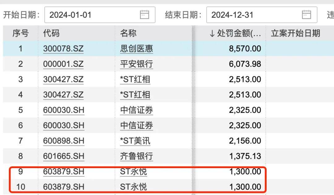 此次ST永悦及相關人員被處罰金額算得上是大手筆。根據Wind數據,「界面新聞·子彈財經」統計了2024年以來A股上市公司被處罰金額,按單筆被罰金額多少來對相關公司進行排名,ST永悦以1300萬元排在第七位。