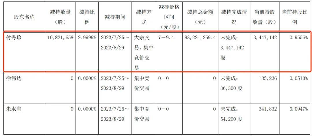2023年7月和8月,公司發佈公告,付秀珍因自身資金需要減持所持有股票,通過減持獲得資金8322.13萬元。