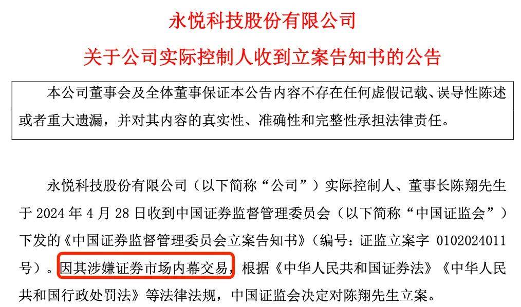 實際上,早在2023年10月11日,ST永悦(原永悦科技)就收到立案告知書。到了今年4月2日,ST永悦發佈公告,公司實際控制人、董事長陳翔因涉嫌信息披露違法違規,證監會對陳翔立案。