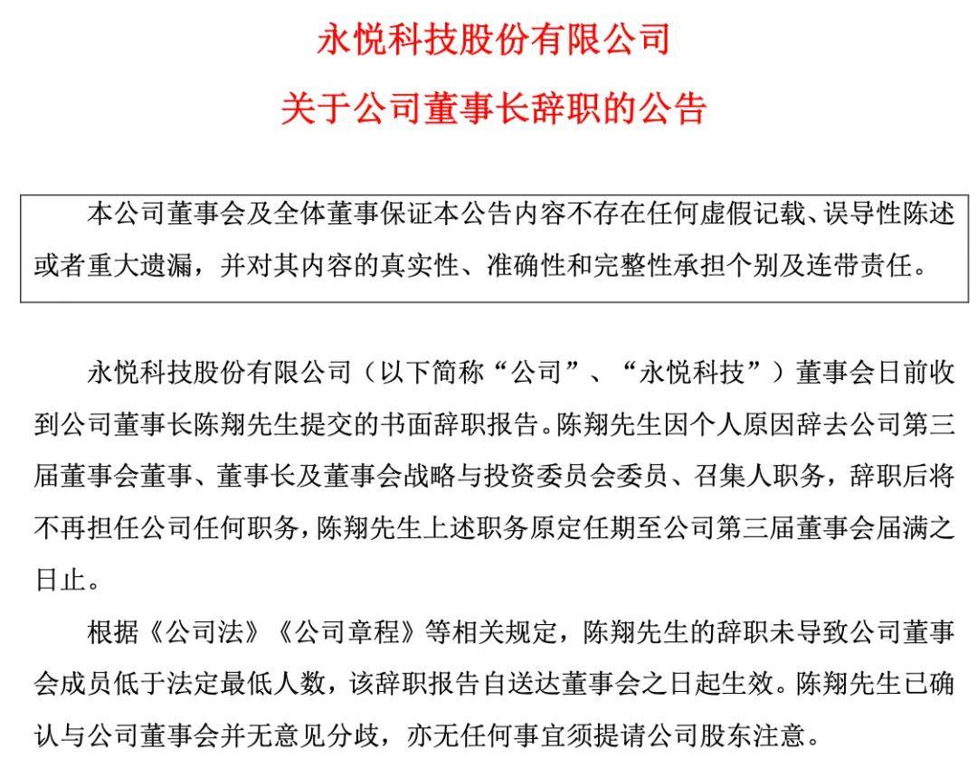 違規事項的認定,也導致了公司管理層的變動。2024年5月31日,ST永悦披露《關於公司董事長辭職的公告》,董事長陳翔已經辭職,辭職後不再擔任公司任何職務,由徐偉達代為履行董事長職務。