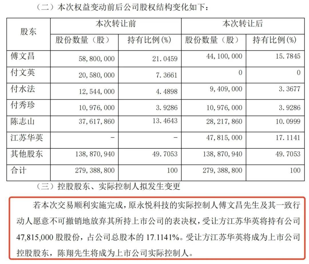 通過此次減持,傅文昌家族失去ST永悦的控制權,公司控股股東變更為江蘇華英,實際控制人變更為陳翔。
