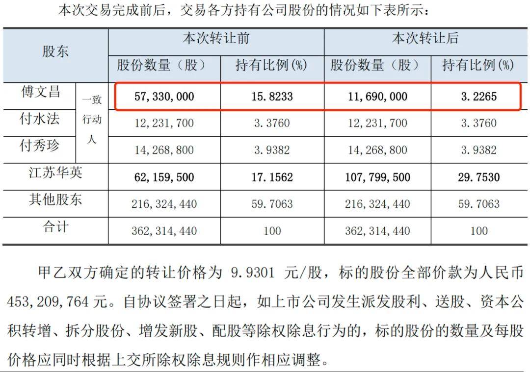 公告顯示,傅文昌將其持有的上市公司4564萬股無限售流通股份,以約9.93元/股的價格轉讓給江蘇華英,總價高達4.53億元。