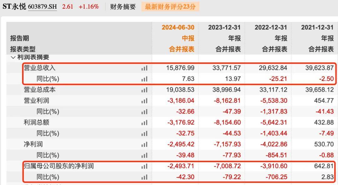 最近兩年ST永悦都處於虧損狀態,且虧損規模還在擴大。2024年上半年,公司仍未扭虧為盈,實現營業收入1.59億元,歸母淨利潤-2493.71萬元。