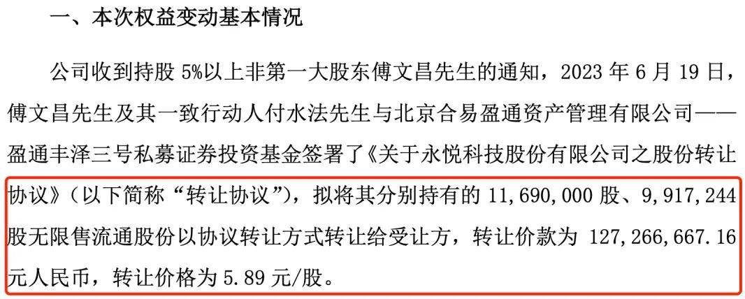 2023年6月20日,ST永悦再次發佈公告,傅文昌和付水法將其持有的股份以5.89元/股的價格轉讓給盈通豐澤三號私募證券投資基金,轉讓價款為1.27億元。