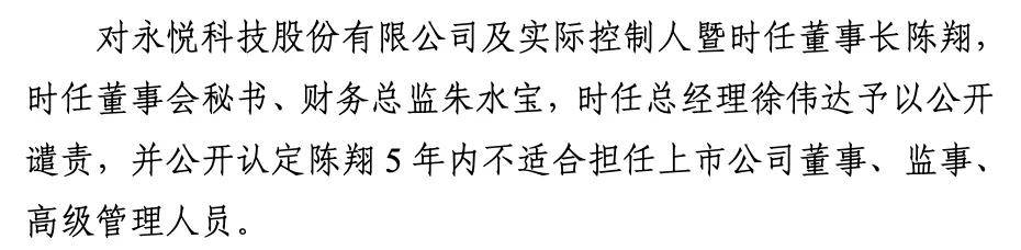 此外,證監會對ST永悦財務總監、時任董事會秘書朱水寶給予警告,處以100萬元罰款;對總經理徐偉達給予警告,並處以70萬元罰款。