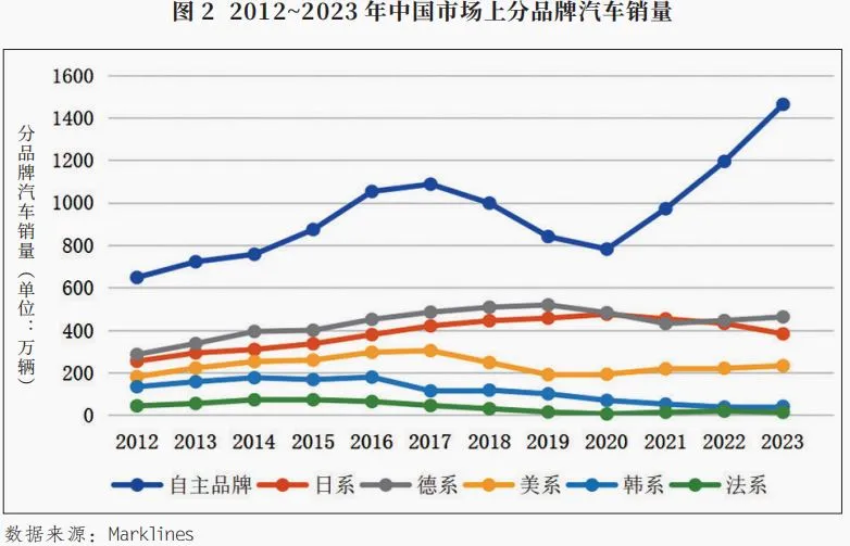 事實上,在我國汽車市場上,自主品牌份額長期無法突破45%的局面是隨着新能源汽車產業崛起而被打破的。不同數據均顯示,我國自主品牌份額在2023年達到55%左右。2020年後,不僅德系、日系、韓系品牌在我國汽車市場的銷量份額呈現明顯的下降趨勢,而且它們銷量的絕對水平也在下降。