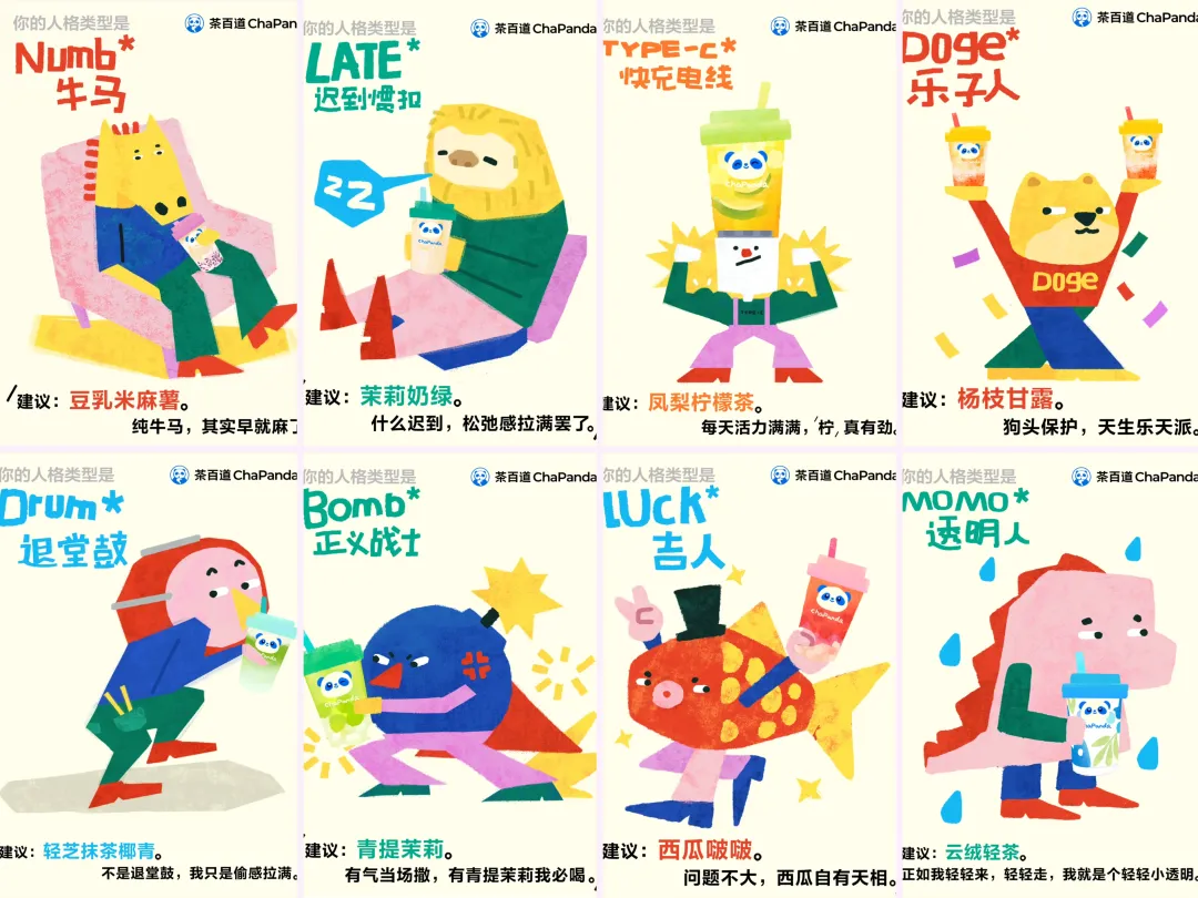 與星巴克的暖心不同,茶百道利用當下熱梗和打工情緒,將MBTI玩出了一種“瘋感”。