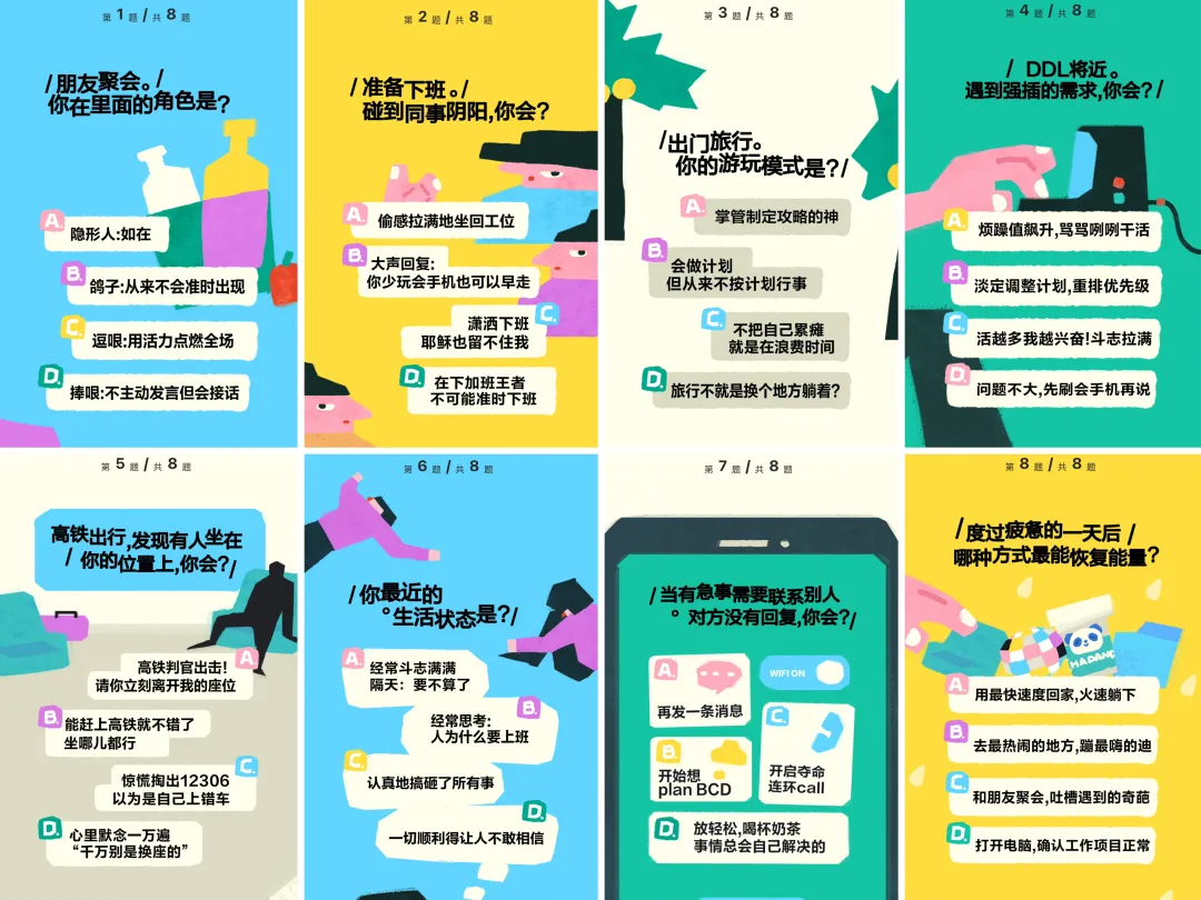 上文提到的MadBTI測試題有8道,十分貼合現實場景。比如“準備下班,碰到同事陰陽,你會?”