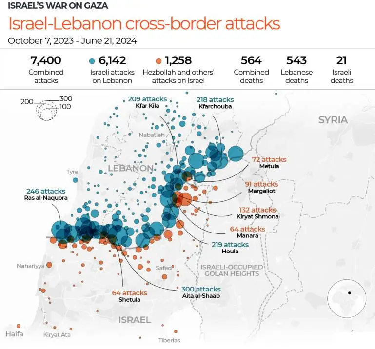 繪製以色列和黎巴嫩之間 8,500 起跨境襲擊地圖(Mapping 8,500 cross-border attacks between Israel and Lebanon)。(2024-8-12日)。ALJAZEERA。