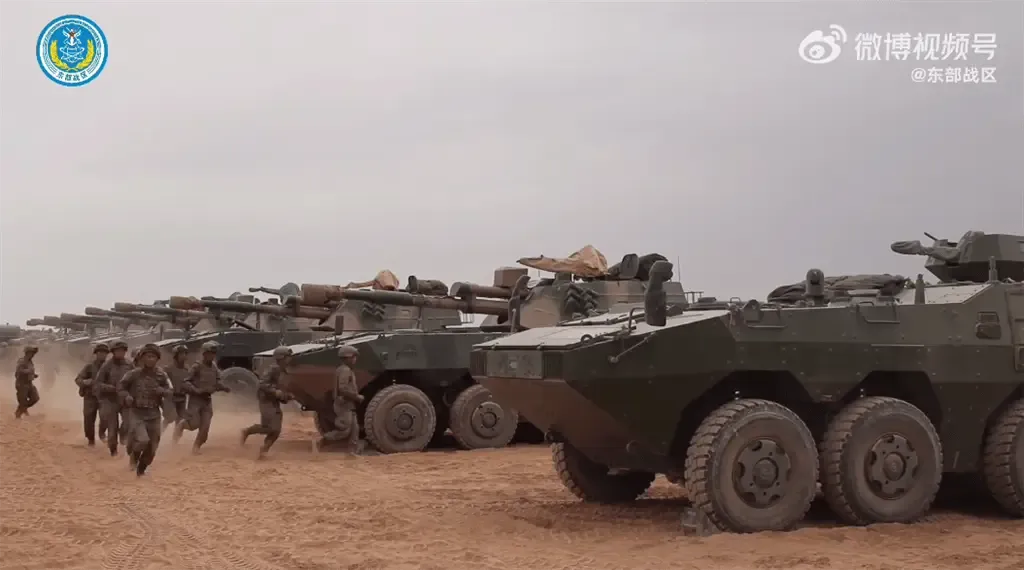 而這次卻上的都是俗稱“大八輪”的08式步戰車和11式輪式突擊炮,全都是解放軍最新的主戰裝備。