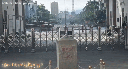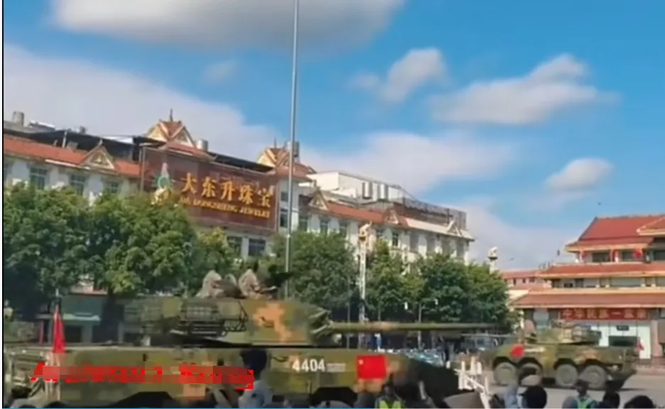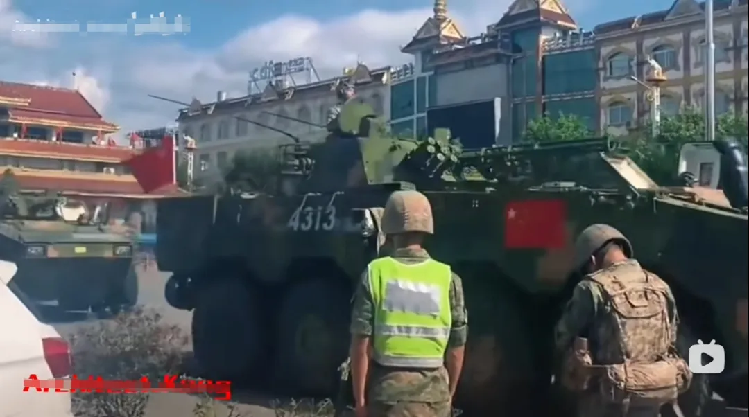 ▲一輛輛08式步戰車和11式輪式突擊炮從中緬口岸門前駛過