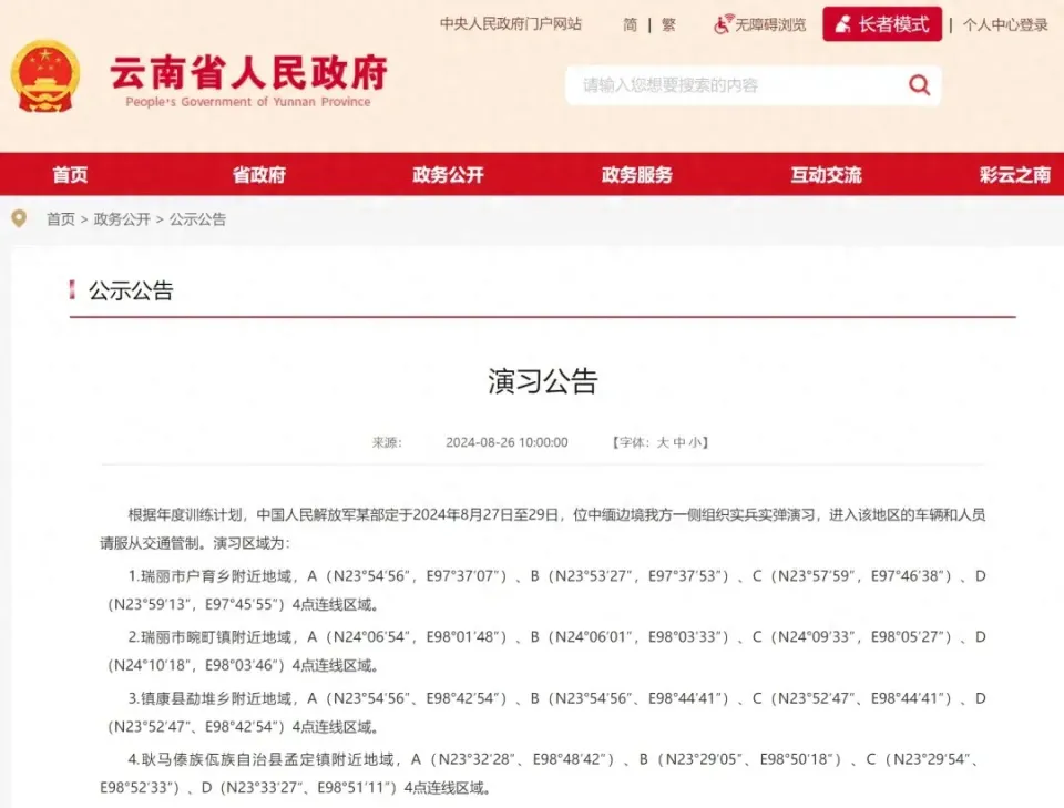6月25日,德昂民族解放軍向位於緬甸政府軍控制的瑙秋、膠脈等市發起攻擊,緬甸局勢又陷入動盪。在這種情況下,南部戰區組織陸、空軍部隊在8月28日至29日進行實兵實彈的演練。