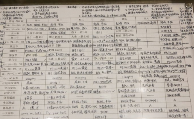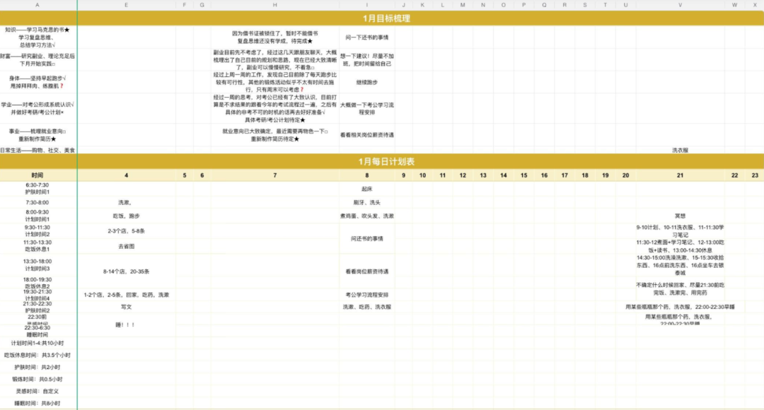 詳細一點也有啊,設定月目標,分到每一天,還有有點時間管理意識的小萌芽,每天 24 個小時,吃飯休息佔多少小時,鍛鍊多少小時,睡覺多少小時,努力了多少小時。