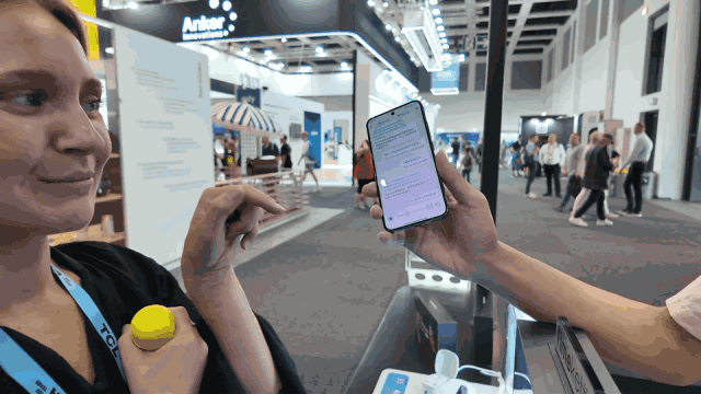 在展台工作人員正在與一位來自瑞典的老外進行交流,只需要在手機讓對方選擇她需要的語言,工作人員選擇中文,一人一個耳機,立馬就開始自然流暢地交流起來了,雙方在耳機中聽到對方語言翻譯成自己習慣語言的同時,手機上也會實時形成文字,讓準確率和交流狀態能夠有雙重的保障。