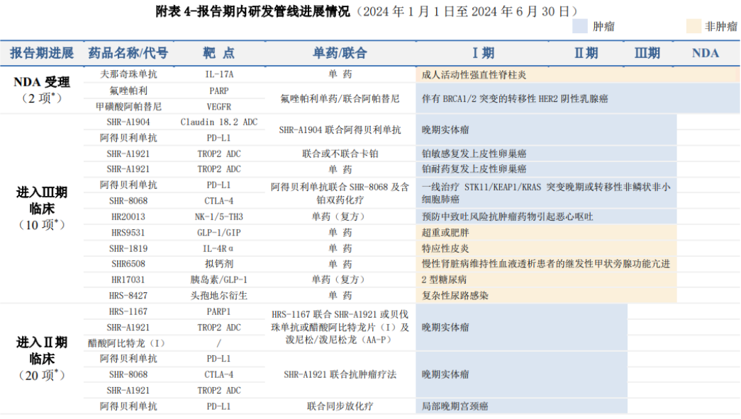 截止2024年6月末,恆瑞醫藥共有14款自研創新藥、2款合作引進創新藥在國內獲批上市,已上市及在研創新藥數量居國內前列。