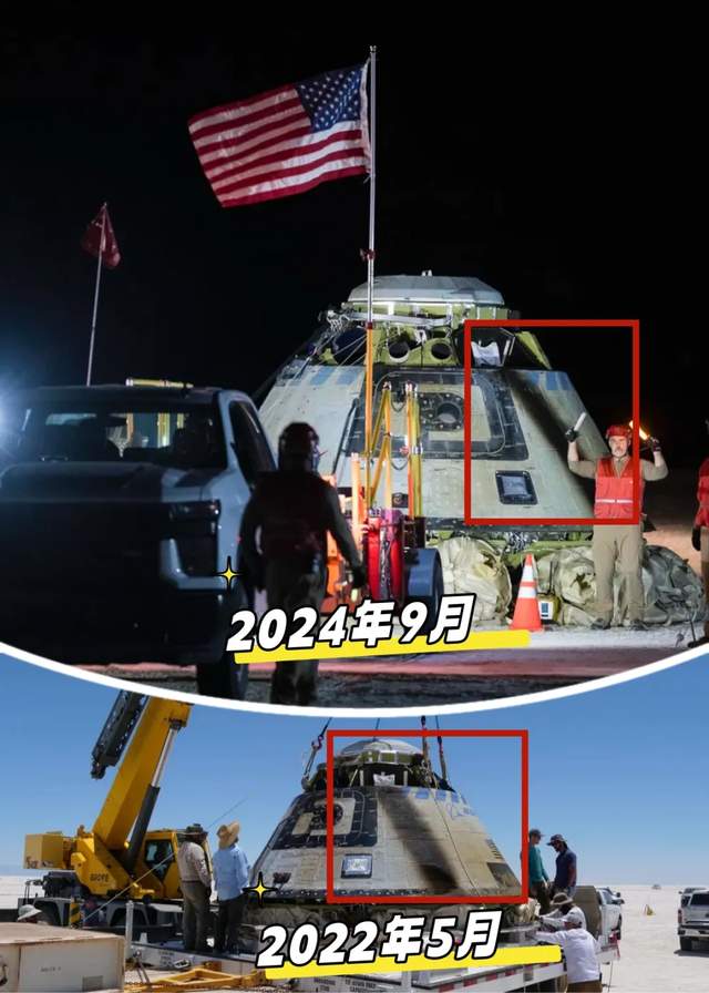 2022年5月25日,波音“星際飛船”試驗取得成功,波音公佈了着陸後的照片。現在拿出來對比,居然兩次的燒蝕痕跡完全一樣,一條黑色的印記從底部延伸到頂部。難道是波音和NASA太高興了放錯了照片,或者是本來就是這樣設計的。