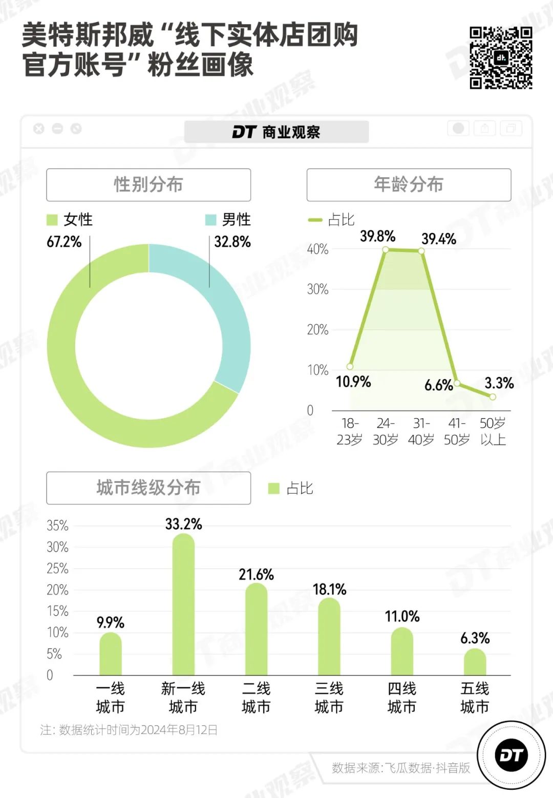 在本地生活業務中,消費者所在城市與門店所在地有較強關聯性,在美特斯邦威團購券可適用的80家門店中,超6成門店位於新一線城市和二線城市,這與美特斯邦威的粉絲畫像相符。