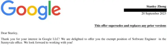 正當鐘調整好心情,準備進入德克薩斯大學就讀的時候,他卻意外獲得了互聯網巨頭,Google所拋出的橄欖枝。谷歌發送Offer給斯坦利·鍾(Stanley Zhong),聘請他為L4級別的工程師。