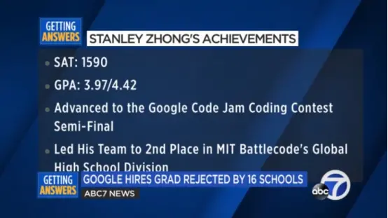 “但還有一個因素,可能是因為鍾在高中時期投入的大量時間學習計算機,他給大多數大學的印象很可能過於單一了。美國大學更喜歡“T”型發展的學生,既要有所專長,也要有廣泛的興趣愛好,”Cardinal教育機構的CEO艾倫·郭(Allen Koh)分析道。