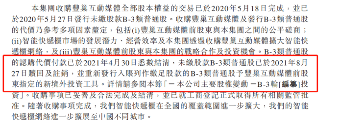 於2020年5月,豐巢收購豐巢互動媒體及發行1040297749股B-3類普通股已完成,但上述股權的股款未繳。直到2021年4月30日,豐巢才結算B-3類普通股實繳資本代價。
