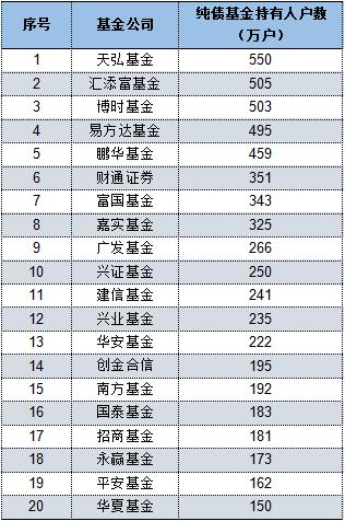 Wind數據統計,截至6月末,純債基金(短債基金+中長期純債基金+指數債基)持有人户數超過300萬户的基金公司有8家,其中天弘基金旗下純債基金持有人數達到550萬户,高居行業第一。