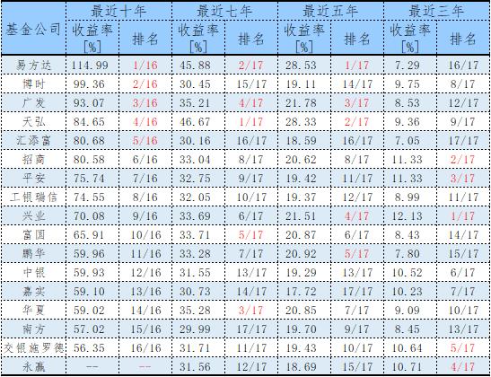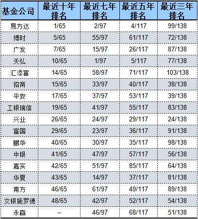 海通證券數據顯示,從2014年7月1日至2024年6月28日的10年間,前述17家固收大型公司在全市場基金公司的業績排名如下。