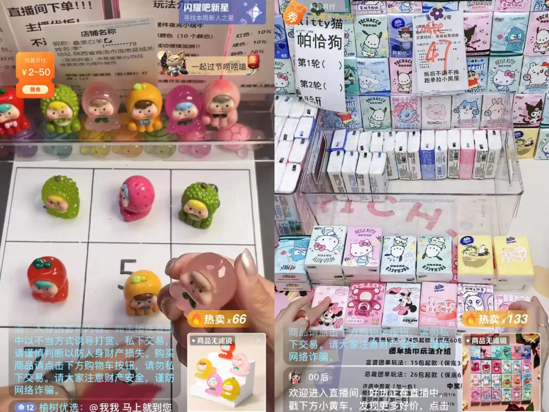 主播會把10種不同顏色的樹脂烏龜裝到盲袋中,玩家下單並且許願中意的顏色,比如全紅嬋就許願的是綠色的小烏龜。然後主播在桌子上放着一張畫有九宮格的白紙,每拆出一個烏龜,就把它放到其中1格里,從1-9放滿為止,填滿九宮格後,每出現一對相同顏色的烏龜,主播就會將「碰掉」,「碰掉」的烏龜就會送給下單的玩家,並再送一包放到九宮格內;開出一條線上的3只同色,再送5包;九宮格湊齊全部9種顏色,也會送出5包;出了玩家許願的顏色,也會送出1包。就這樣拆完所有購買和贈送後的烏龜盲袋後,開出的所有烏龜擺件都會打包寄給玩家。