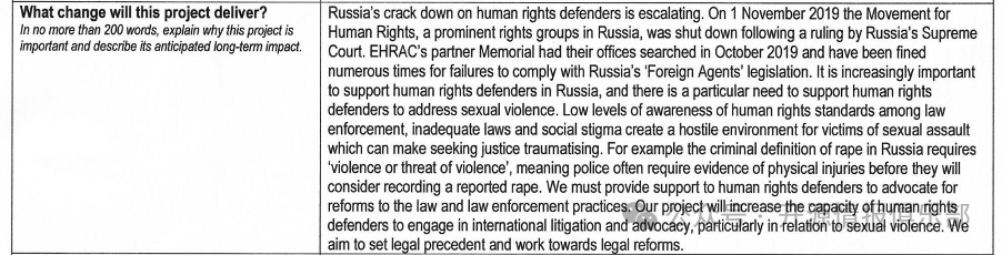 俄羅斯對人權捍衞者的鎮壓正在加劇。 2019年11月1日,俄羅斯知名人權組織“為了人權”運動被俄羅斯聯邦最高法院決定關閉。2019年10月,紀念組織(EHRAC合作伙伴)的辦公室遭到搜查,並因不遵守俄羅斯有關“外國代理人”的立法而多次受到起訴。俄羅斯人權捍衞者的支持變得越來越重要,對於打擊性暴力尤其必要。執法部門對人權標準的認識水平低、法律不完善以及社會恥辱為性暴力受害者營造了一個充滿敵意的環境,這可能會給尋求正義帶來痛苦。例如,俄羅斯對強姦的刑事定義要求“暴力或暴力威脅”,這意味着警方在考慮記錄舉報的強姦案之前通常需要提供傷害證據。我們必須支持人權維護者,以便他們能夠倡導立法和執法改革。該項目將加強人權維護者參與國際訴訟和宣傳的能力,特別是在性暴力方面。我們努力樹立法律先例並致力於法律改革。