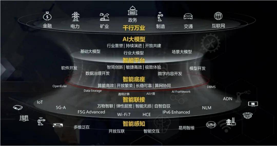 華為利用過去30多年服務各個行業的數字化、智能化經驗,提出了行業智能體參考架構,並將其分為智能感知、智能聯接、智能底座、智能平台和AI大模型五層,可以理解為數智化轉型的路線圖。