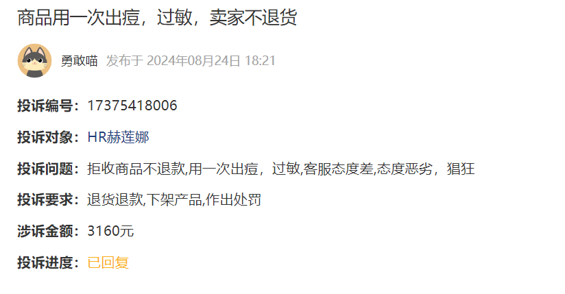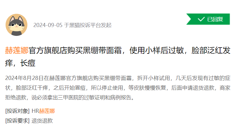 例如,黑貓投訴最新投訴內容顯示,一位消費者於2024年8月底在HR赫蓮娜官方旗艦店購買了熱潮的黑繃帶面霜產品。使用小樣後過敏,臉部發紅髮癢並長痘。但商家拒絕退款並要求拿出三甲醫院的過敏證明和病例報告。
