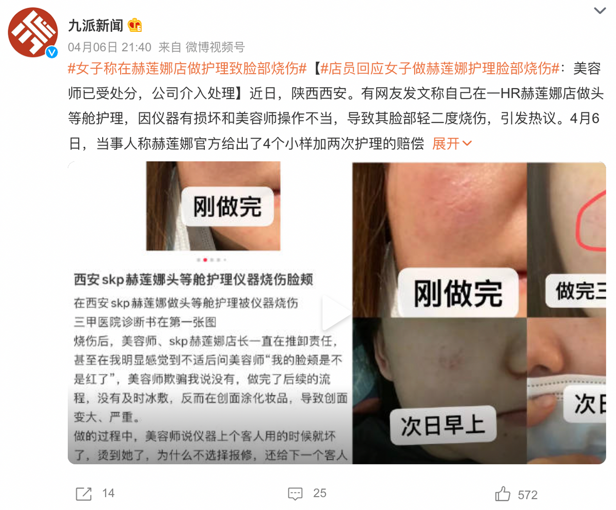 不過,HR赫蓮娜也有“翻車”的時候。2023年4月初,根據九派新聞報道,近期有消費者在網上發文稱,自己在西安SKP HR赫蓮娜店內做頭等艙護理後,因儀器有損壞和美容師操作不當,導致其臉部輕二度燒傷。事後,該消費者表示,HR赫蓮娜官方給出了4個小樣加兩次護理的賠償方案,被自己拒絕。