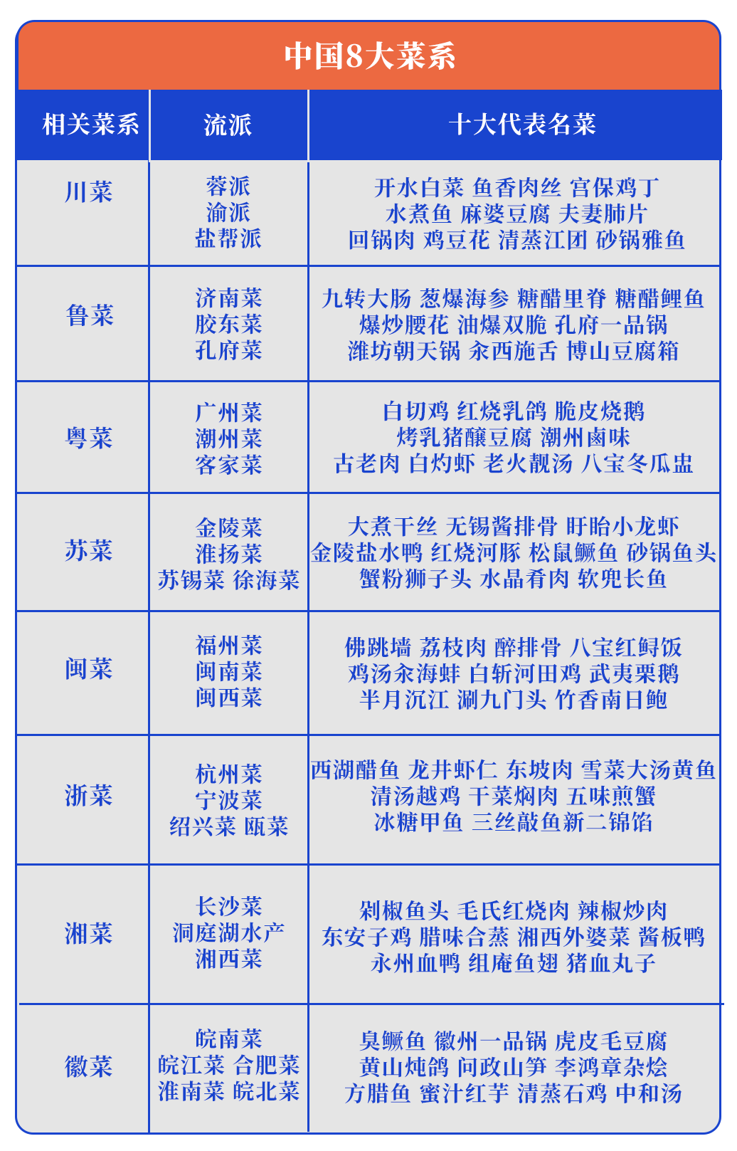 川菜的麻、湘菜的辣、粵菜的鮮、閩菜的醇、蘇菜的甜、浙菜的雅、徽菜的珍、魯菜的鹹香,八大菜系各具特色。