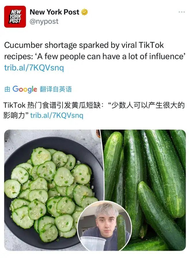 前段時間一位外國博主發佈了一則黃瓜的推薦吃法,食譜竟意外走紅成洋抖最火食譜。