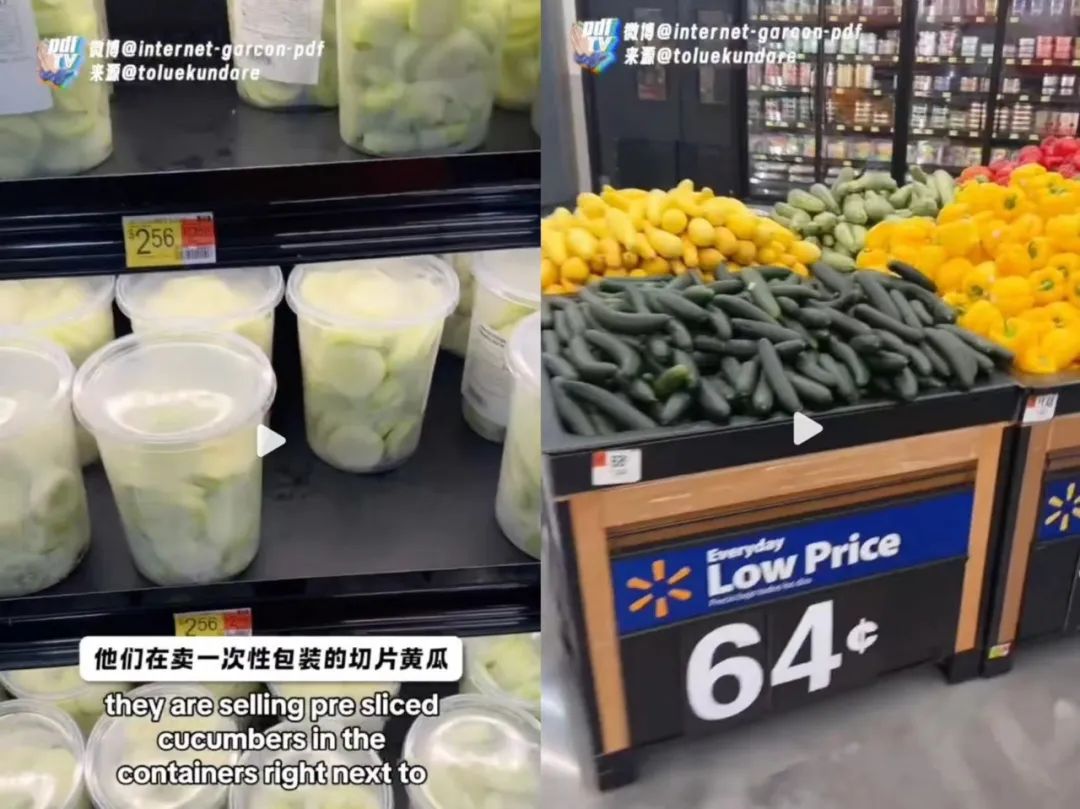 因為清脆爽口還減脂,這道涼拌黃瓜一下在互聯網上爆火了,外國超市甚至直接買起了一次性包裝的黃瓜切片,而貨架旁邊就是更便宜的整根黃瓜。