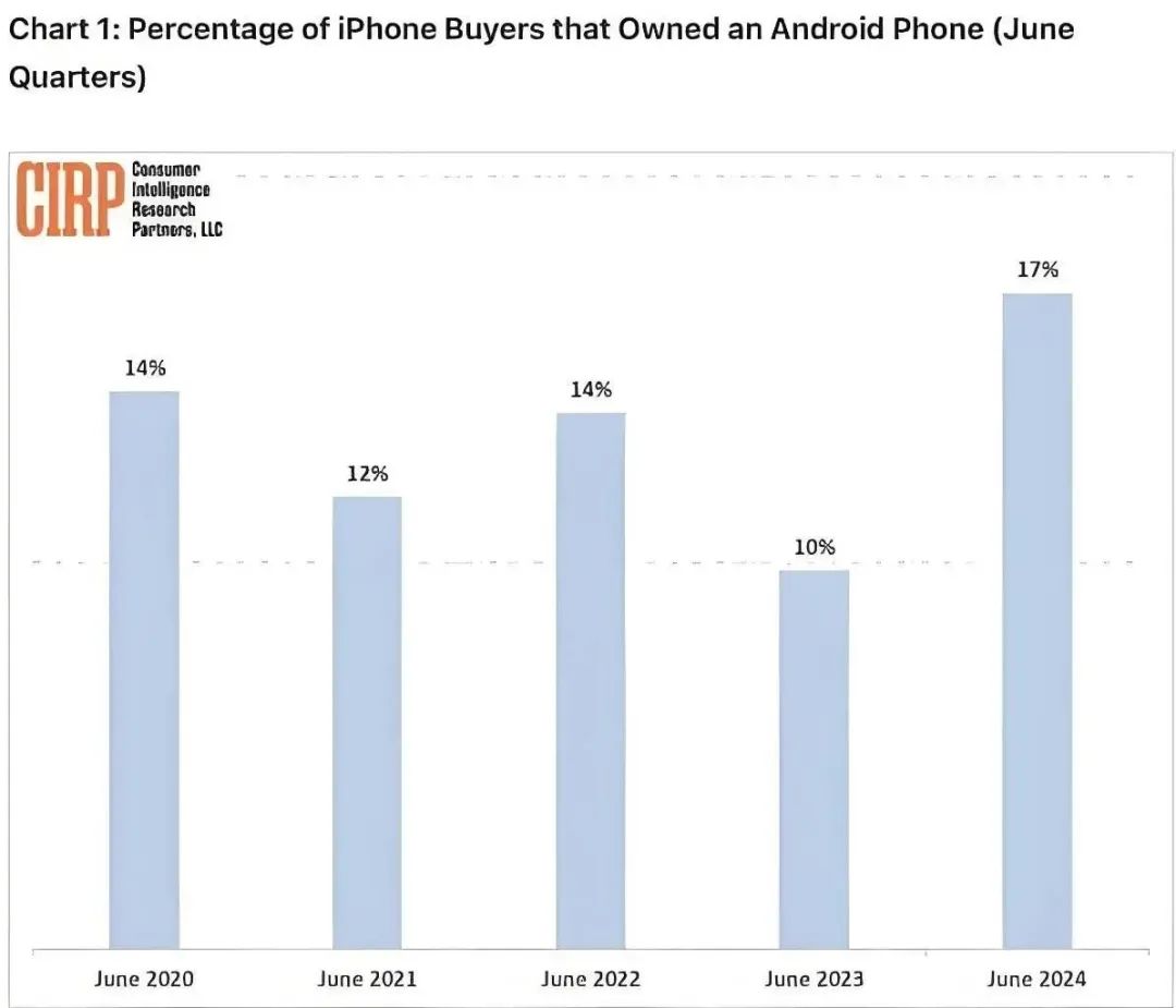 根據消費者情報研究合作伙伴(CIRP)的一份報告顯示,今年第二季度購買iPhone的用户中,有17%是從安卓系統切換過來的,這一比例創下五年來新高,幾乎是去年同期(10%)的兩倍。