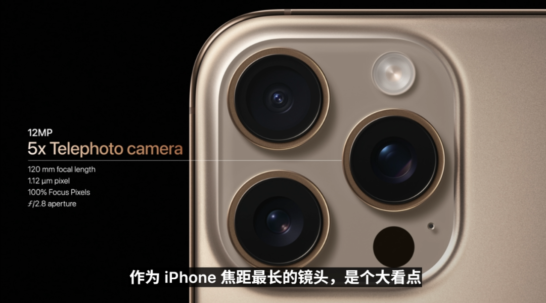 去年的 iPhone 15 Pro 和 Pro Max ,兩款手機的長焦鏡頭分別是 3 倍和 5 倍,而今年果子一視同仁,兩款 Pro 手機都用上了 5 倍長焦鏡頭。