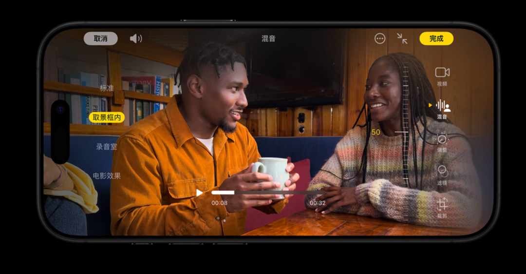 相當於説,假如你是個拍微短劇的小劇組,以前還需要單獨僱一個人在旁邊扛麥克風,以後就可以直接交給 iPhone 16 Pro 內錄,並且在 iPhone 16 Pro 裏進行混音。。。