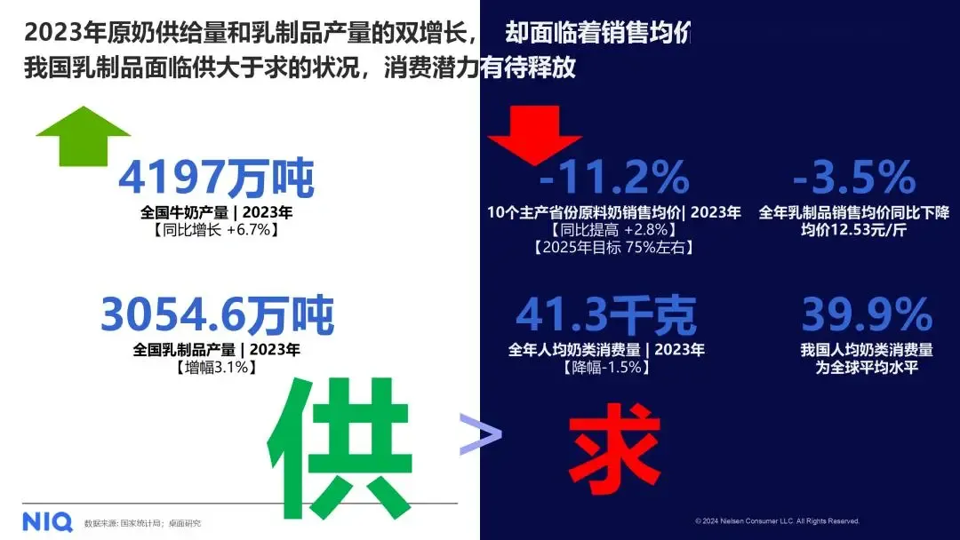 首先,乳業市場正在面臨前所未有供需失調。尼爾森發佈的《中國乳品市場趨勢與展望報告》顯示,2023 年,全國原奶產量高達 4197 萬噸,同比增長 6.7%,乳製品產量也達到了 3054.6 萬噸,同比增長 3%。然而,2023 年全國人均乳製品消費量僅為 41.3 千克,同比下跌了 1.5%,僅僅達到全球平均水平的 40%。嚴重的供需失調,讓整個乳品行業都身處險境。