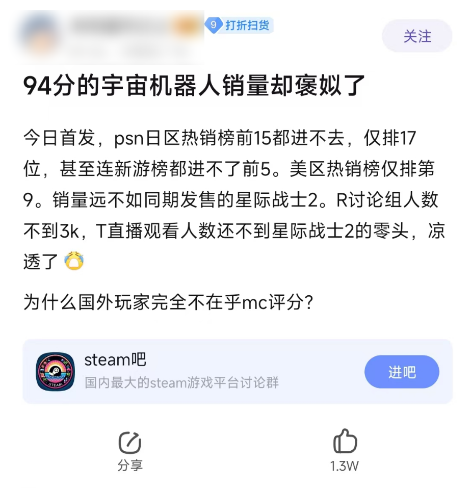 有人看它 MC 評分領先黑猴,彷彿終於找到了可以打壓黑神話的對手,便開始封神狂吹;