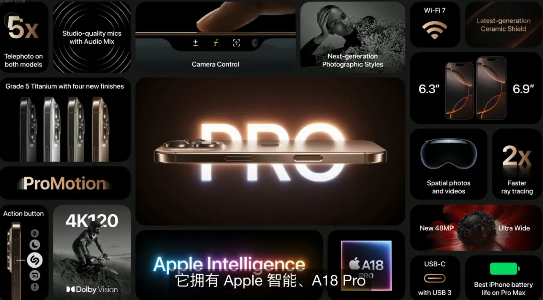 不過,AI是這場發佈會的重要看點,蘋果發佈的幾乎每款產品都配置了一定的智能能力,圍繞 Apple Intelligence,涵蓋語言、視覺、健康、生活等諸多方面。